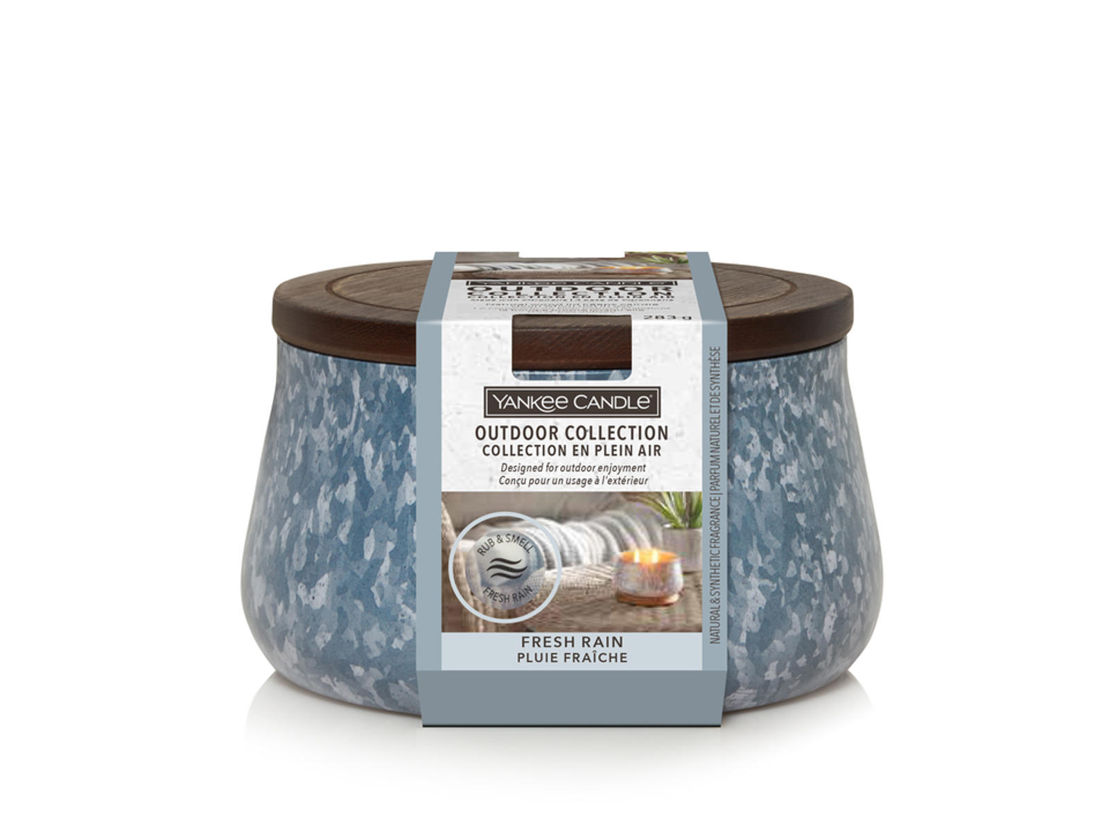 Havelys skaber udendørs atmosfære! Outdoor Collection fra Yankee Candle er en ny måde at nyde kvaliteten og de naturtro dufte udenfor! Duftlys får et nyt formål, når vejret kalder på udendørsliv. En uventet glød og en dejlig, velkendt duft i luften skaber en atmosfære, der forvandler aftenen. Udendørs stearinlys blev skabt specielt til haven, verandaen og terrassen for at give belysning og duft, der hygger om dine udendørs aktiviteter. Med dufte designet af Yankee Candle-eksperter og kombineret med citronella og andre æteriske olier, er Outdoor Candle Collection specielt skabt til optimal ydeevne udendørs. Det er afbalancerede og naturtro dufte til udendørs brug, der gør enhver sommeraften til noget mindeværdigt. Udendørs stearinlys er fremstillet af en unik voks med et højere smeltepunkt, designet specielt til udendørs nydelse. Lyset er anbragt i et dekorativt blikkar med et naturligt trælåg, designet til at modstå udendørs elementer, og som holder voksen beskyttet, når lyset ikke er i brug, og de to store væger garanterer god oplysning. Fresh Rain: Lys din terrasse op med en frugthave i blomst - fyldt med noter af sprødt æble og roser, balanceret med dufte af rosmarin. Topnote: Æble, frugtnote, citrus Mellemnote: Rose, cyclamen, liljekonval Bundnote: Vandrige blomster Brændetid: Op til 24 timer. Vægt: 283g. Vægt inkl. emballage: 430g.