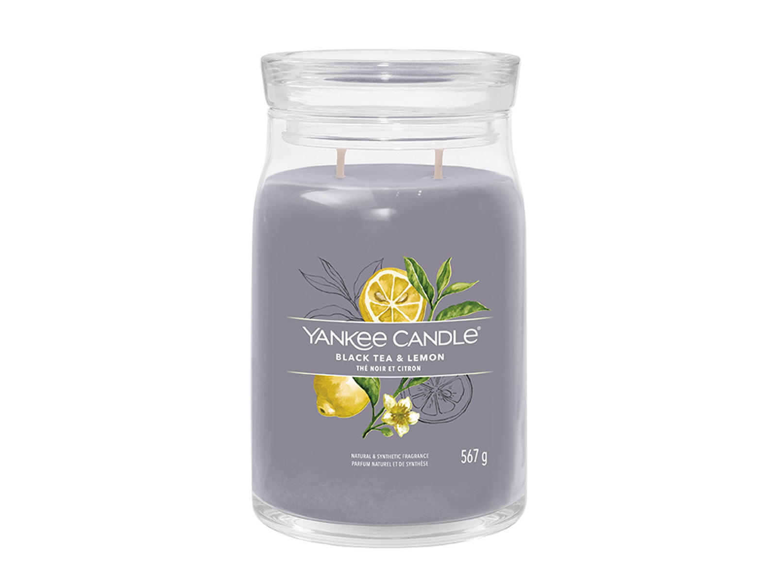 Duftlysene fra Yankee Candle Signature Collection er fuldstændig nytænkt. Den forfriskende version af det ikoniske Apotekerglas er designet til at skabe den bedste oplevelse. To bomuldsvæger og en premium sojavoksblanding er, sammen med de smukke håndillustrerede etiketter og livlige voksfarver, perfekt matchet med de eksklusive dufte. Lysene er elsket for deres lange brændetid, og er sublime til at give stil og klasse til den personlige indretning med lækre farver og skønne dufte. Signature Collection har skabt en kollektion af smukke, aromatiske duftlys, som frigiver en dejlig aroma og vil glæde dine sanser og oplive dit hjem. Duftlysene er også populære gaver, som holder længe og kan personliggøres med en yndlingsduft. Når lyset er brændt ud, kan glasset genbruges til ny dekoration eller som almindelig opbevaring. Find selv din yndlingsduft blandt de mange muligheder i duftspektret, der opfrisker, beroliger og fængsler. Nyd dine favoritter både indendørs og udendørs - de er også perfekte til terrassen på en varm sommeraften. Black Tea & Lemon: Et forfriskende bud på en klassiker – sort te sødet med vanilje, blødgjort med moskus og afsluttes med et twist af citron. Topnote: Yuzu, citron, lyserød peber Mellemnote: Sorte sesamfrø, ingefær, limeblade Bundnote: Varm vanilje, nelliker, kokosnød, cremet moskus Brændetid: Large 60-90 timer. Vægt 567g. Vægt inkl. glas 1.020g