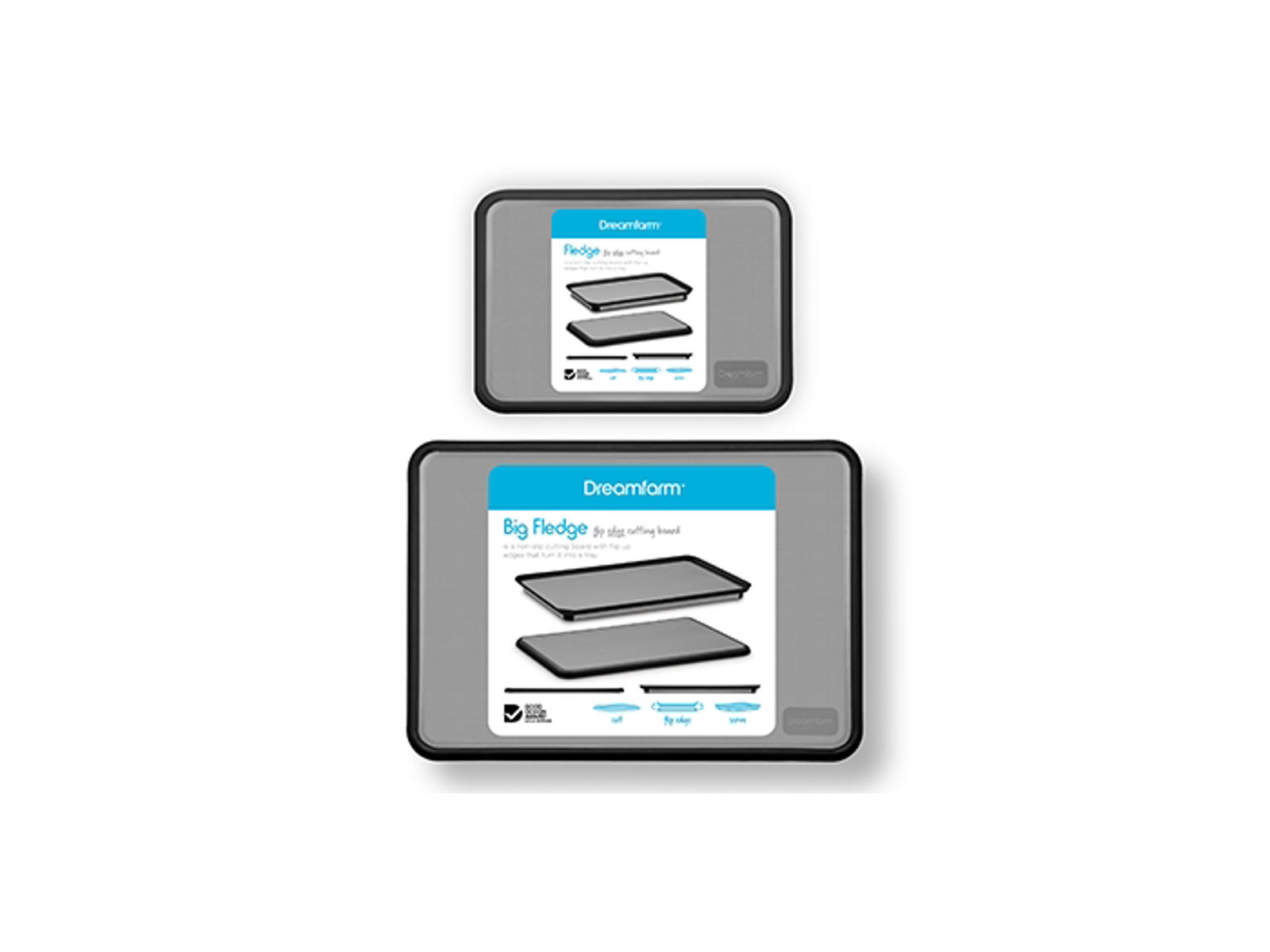 Dreamfarm Set of Fledge – prisvindende skærebrætter med opsamlingsbakke. Fledge fra Dreamfarm er et smart dobbeltsidet skærebræt med fleksible kanter, der vippes op for at gøre den til en bakke og forhindre, at maden falder ned, hvilket gør den perfekt til servering. De unikke flip-up kanter forhindrer også maden i at falde eller rulle af siderne, når det transporteres fra køkkenbordet til komfuret eller grillen. Fledge har skridsikre gummifødder på begge sider, for at holde den sikker og give dig kontrol mens du skærer. Den har knivvenlige mønstre på begge sider og bøjer ikke efter maskinopvask. Fledges udskæringsside har en generøs juicerille til at opfange kødsaft og lign., når du skærer steg og andre saftige fødevarer. Kan nemt klemmes sammen til en lille tud, så væsken kan hældes over i en gryde til brug i saucer el.lign. Sættet leveres med en sort fod til opbevaring af skærebrætterne på køkkenbordet eller i skabet. Mål Fledge: L:175xB:245xH:15. Mål Big Fledge: L:350xB:245xH:15. Materiale er polypropylen, TPE. BPA-fri. Tåler opvaskemaskine.