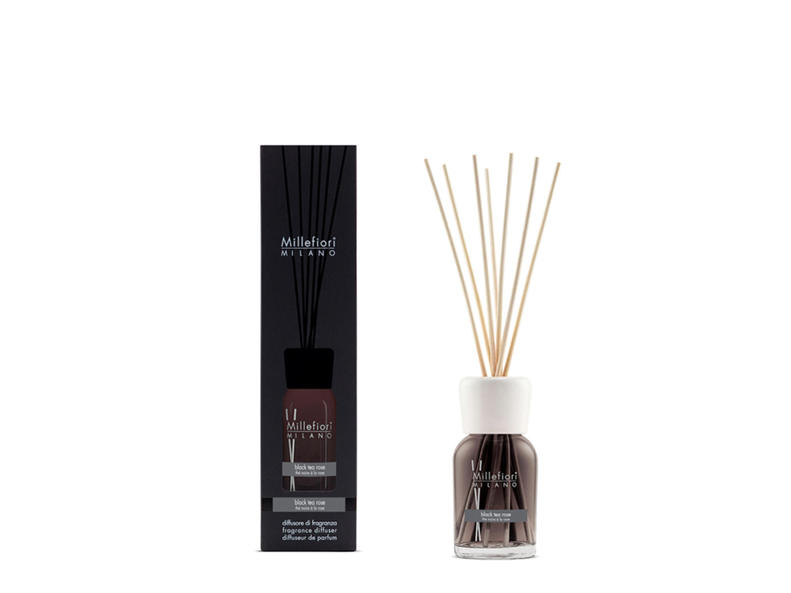 Millefiori Stick Diffuser 100 ml Black Tea Rose er en aromaterapiprodukt, der er specielt designet til at sprede en blød og sensuel duft i dit hjem eller kontor.