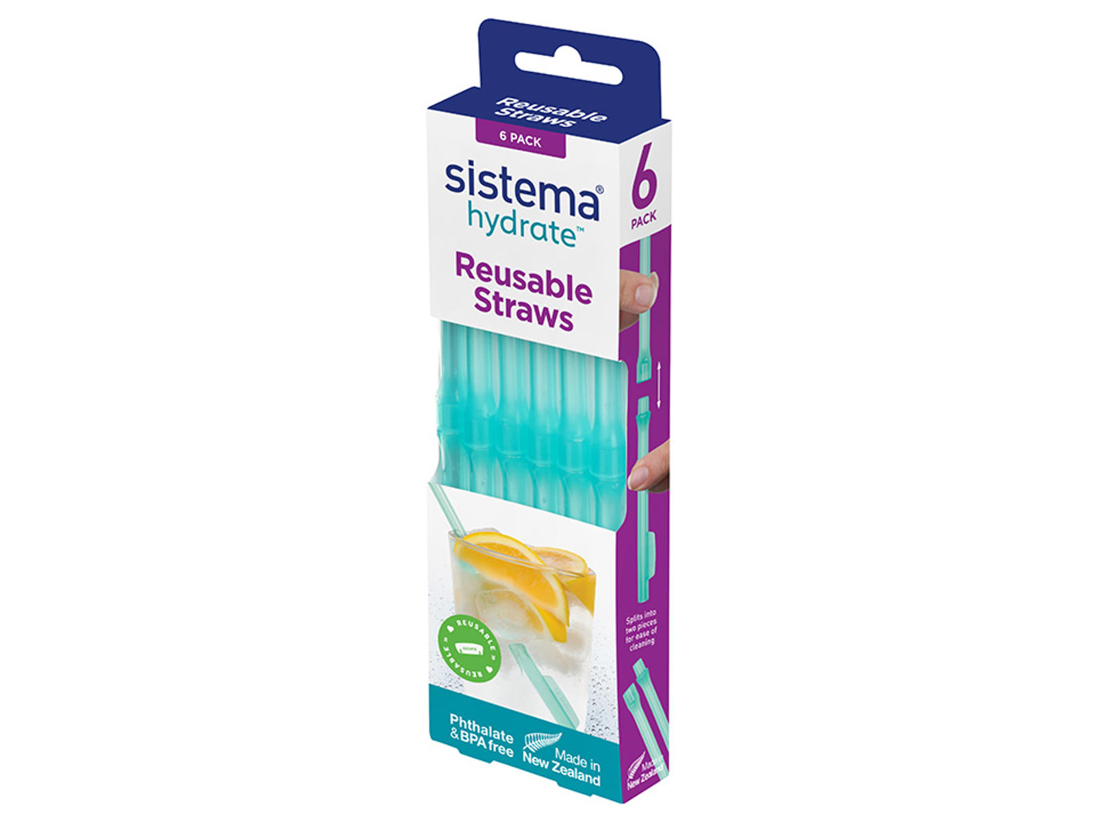 Praktisk pakke med 6 genanvendelige sugerør opdelt i to stykker for nem opbevaring og rengøring.