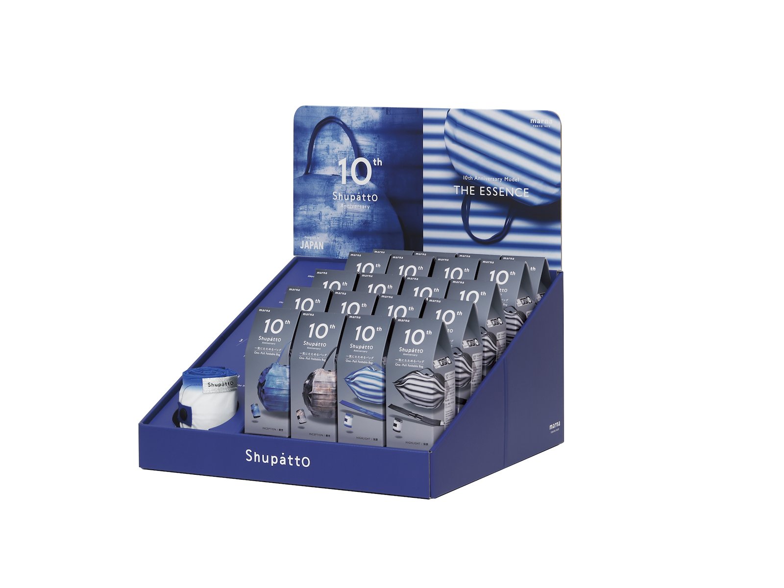 Celebrate the innovation and design of Shupatto with this exclusive Shupatto Counter Display – 10th Anniversary Edition. The display is designed to highlight the iconic Shupatto folding bags while marking the brand’s 10-year anniversary.