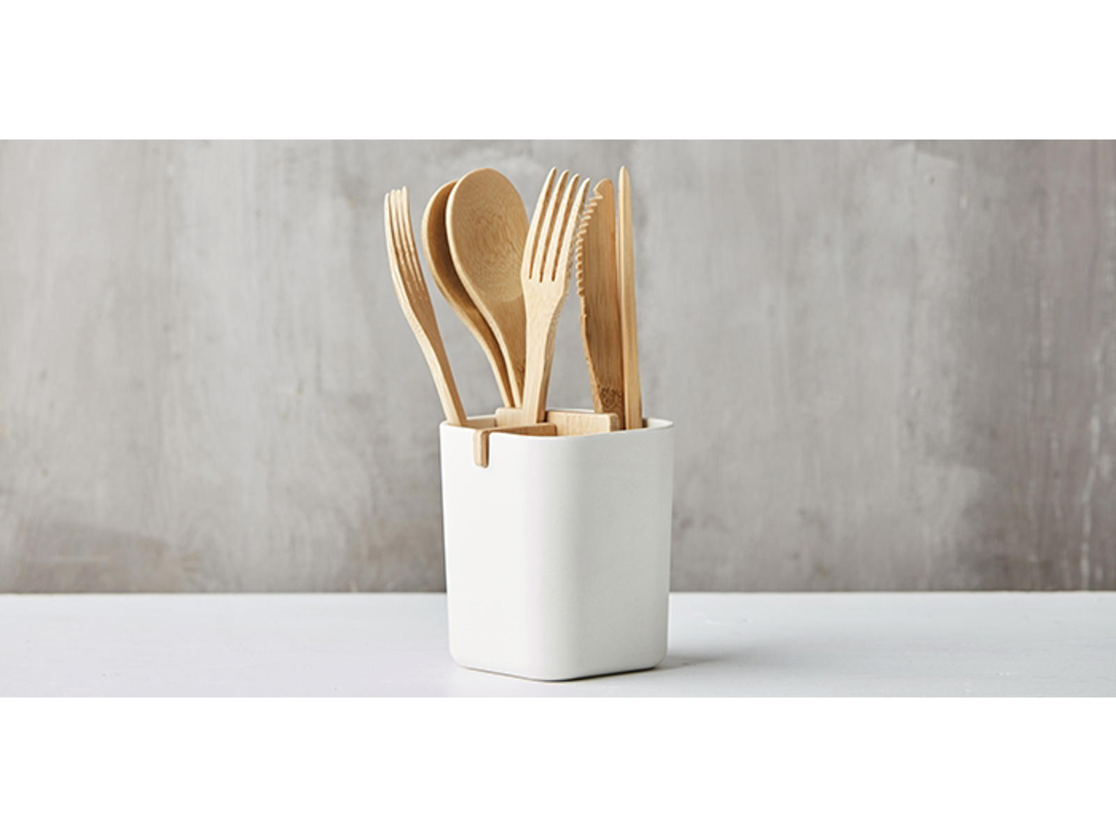 Point Virgule, square organizer with 4 compartments, is a multifunctional 4 compartment container that can be used in home decor. Use it to store kitchen utensils, cutlery, dishes, toothbrushes, make-up brushes, writing utensils, etc. The container is off-white and is made from bamboo fiber and bamboo.